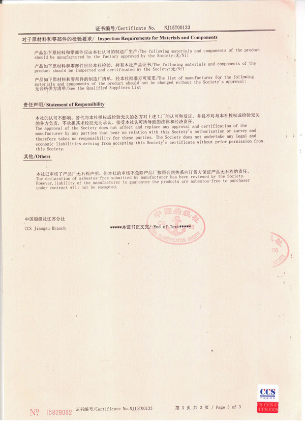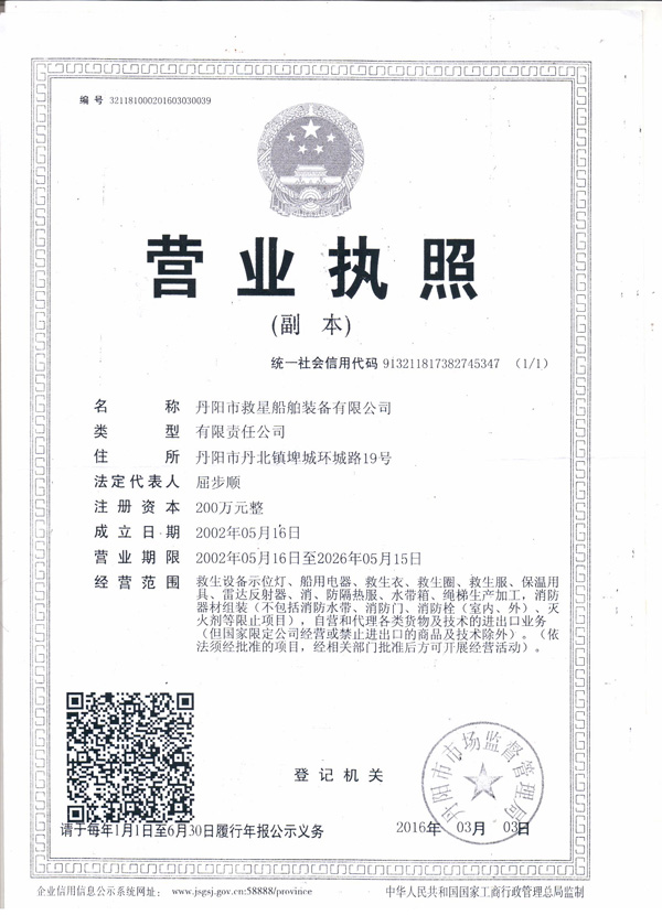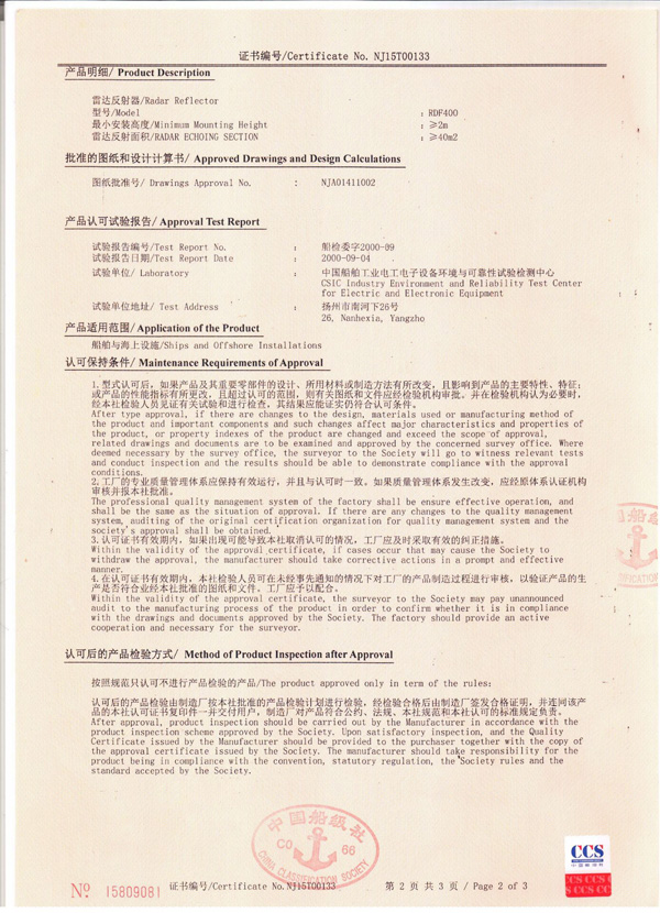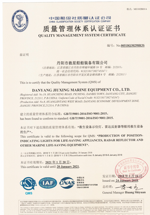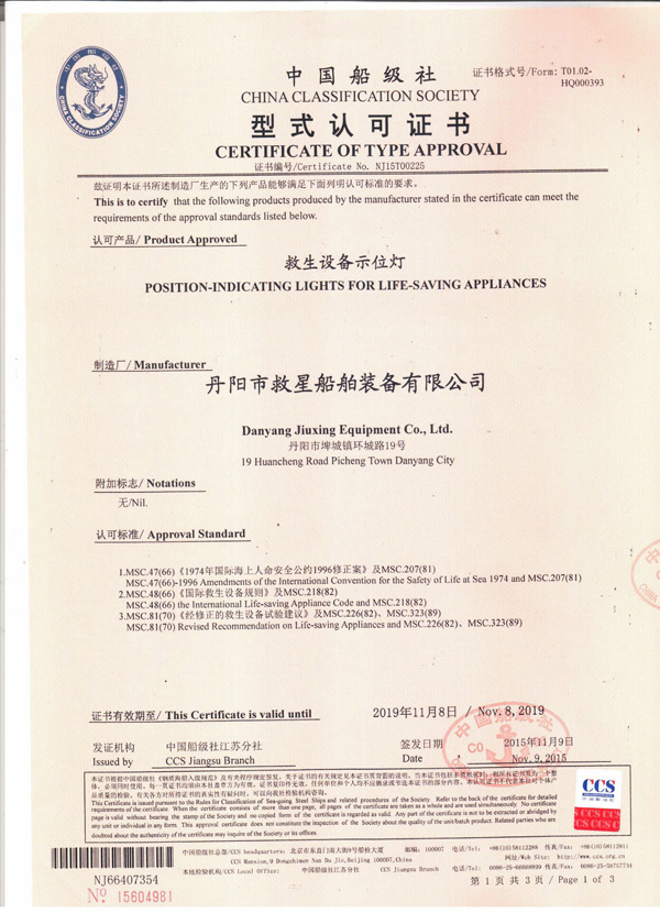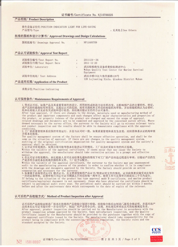 丹陽(yáng)市救星船舶裝備有限公司為丹陽(yáng)市船舶救生照明設(shè)備廠子公司,主要生產(chǎn)救生設(shè)備示位燈、雷達(dá)反射器、引航員軟梯、登乘梯等產(chǎn)品。其中救生設(shè)備示位燈采用國(guó)際上最先進(jìn)的科學(xué)技術(shù)、生產(chǎn)工藝,優(yōu)質(zhì)材料制造,各項(xiàng)技術(shù)指標(biāo)超過(guò)國(guó)際先進(jìn)水平,完全滿足國(guó)際最新標(biāo)準(zhǔn)。2012年元月取得“CCS”型式認(rèn)可證書(shū),并具有歐共體“EC”證書(shū)。另外本公司制造的RDF400雷達(dá)反射器還獲得了實(shí)用新型專(zhuān)利。